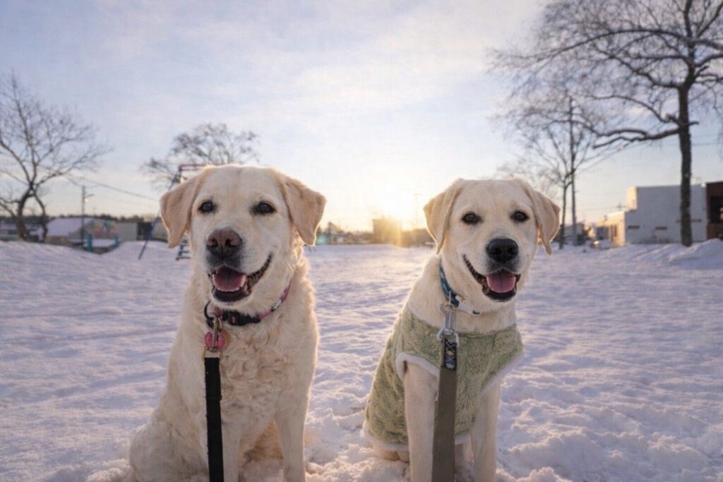 リバティアイランドでお預かりしているワンちゃんたちも、まさに「駆ける馬」に負けないくらい元気いっぱいです! キリッと冷えた冬空の下、軽やかな足取りでお散歩を楽しむ姿は、見ている私たちまで背筋が伸びるようなパワーをもらえます。 寒さに負けず、しっぽを振って雪の残る道を歩く姿は、どの子も本当に楽しそうです。